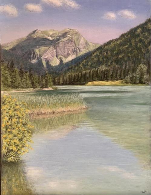 Au final j’ai remarqué plusieurs sous thèmes : m’ont inspirée les fleurs, un peu les animaux, les paysages de mes vacances, beaucoup les paysages Chablaisiens, les lacs de montagne, les paysages autours des lacs Léman et annécien, les rivières et lacs.